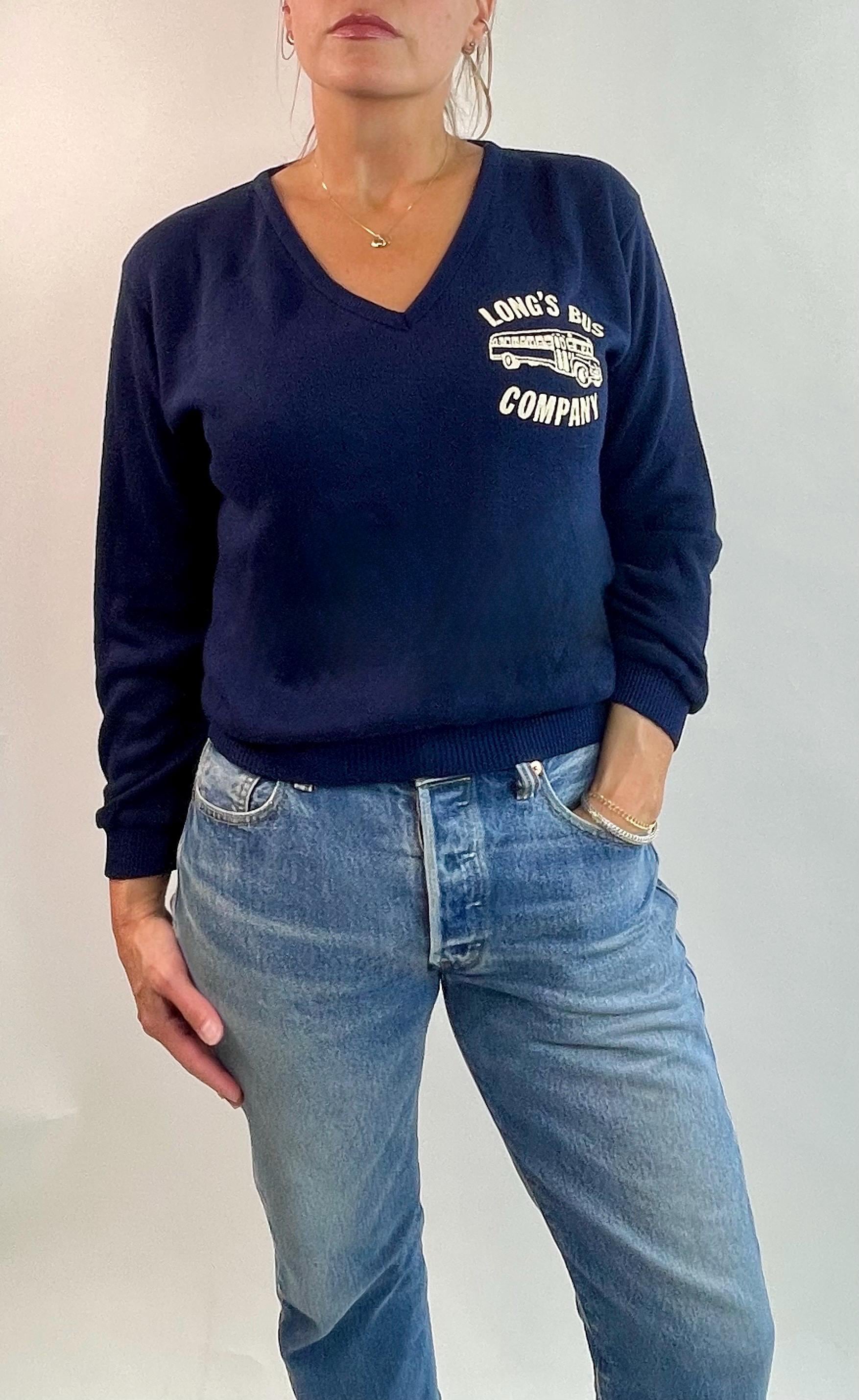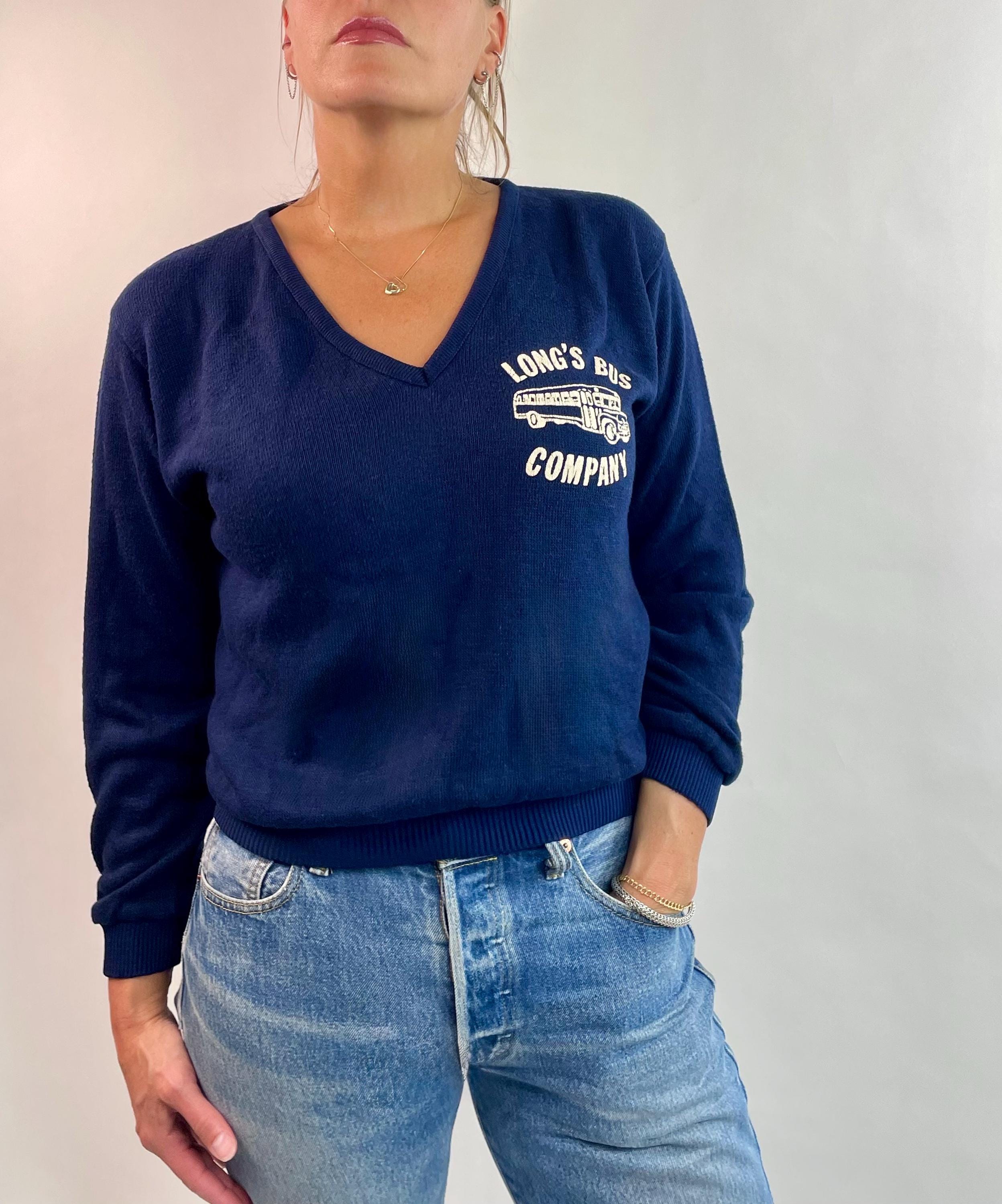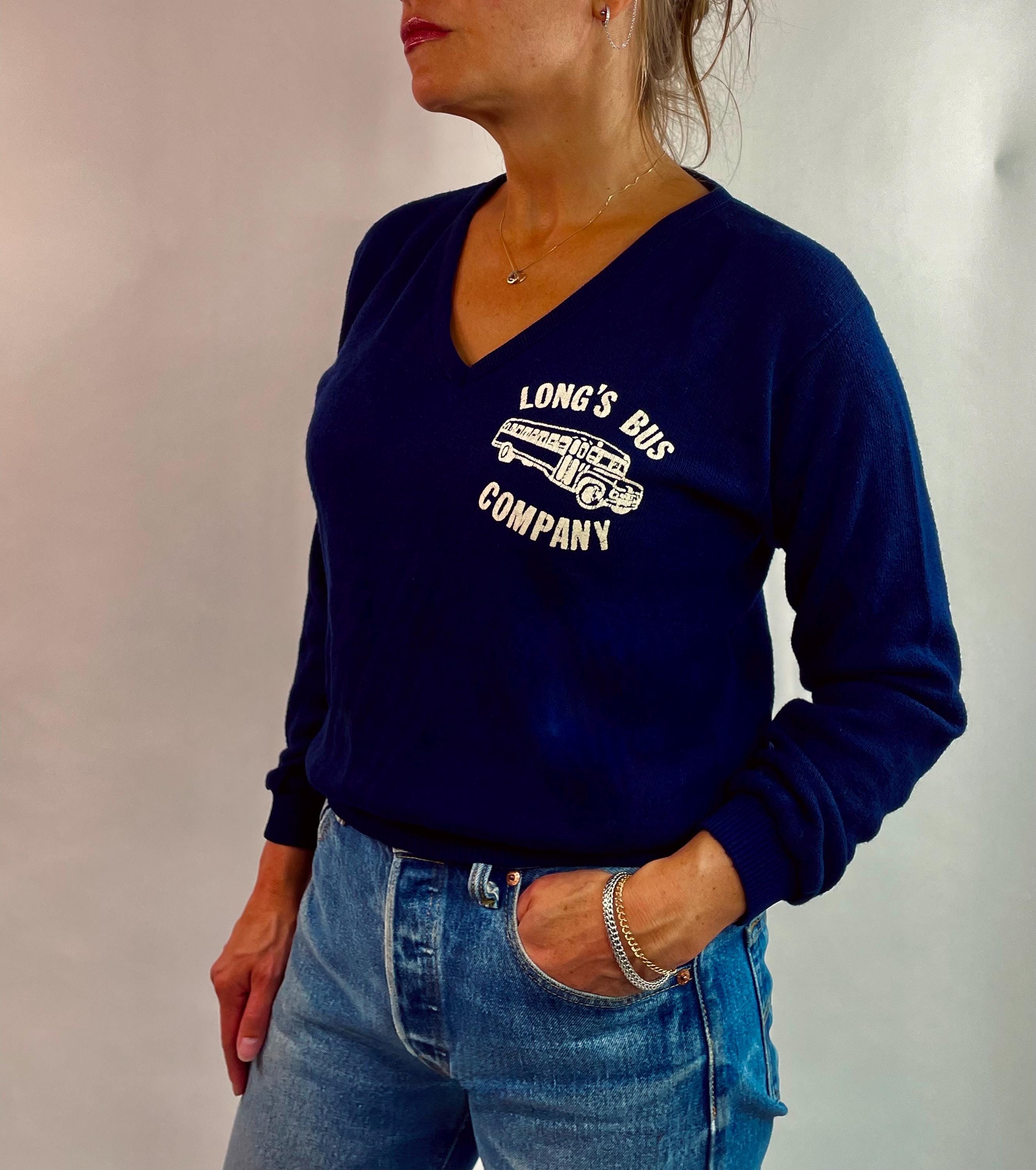 Vintage late 70's logo print V neck knit sweater top in navy blue in a soft, over- time washed acrylic and wool blend. Fabric has some stretch to it. Has white logo of Long's Bus Company. Vintage 90's looking grunge chic! Has elasticized waistband and cuffs. Vintage size S. Fits modern sizes S-M best.