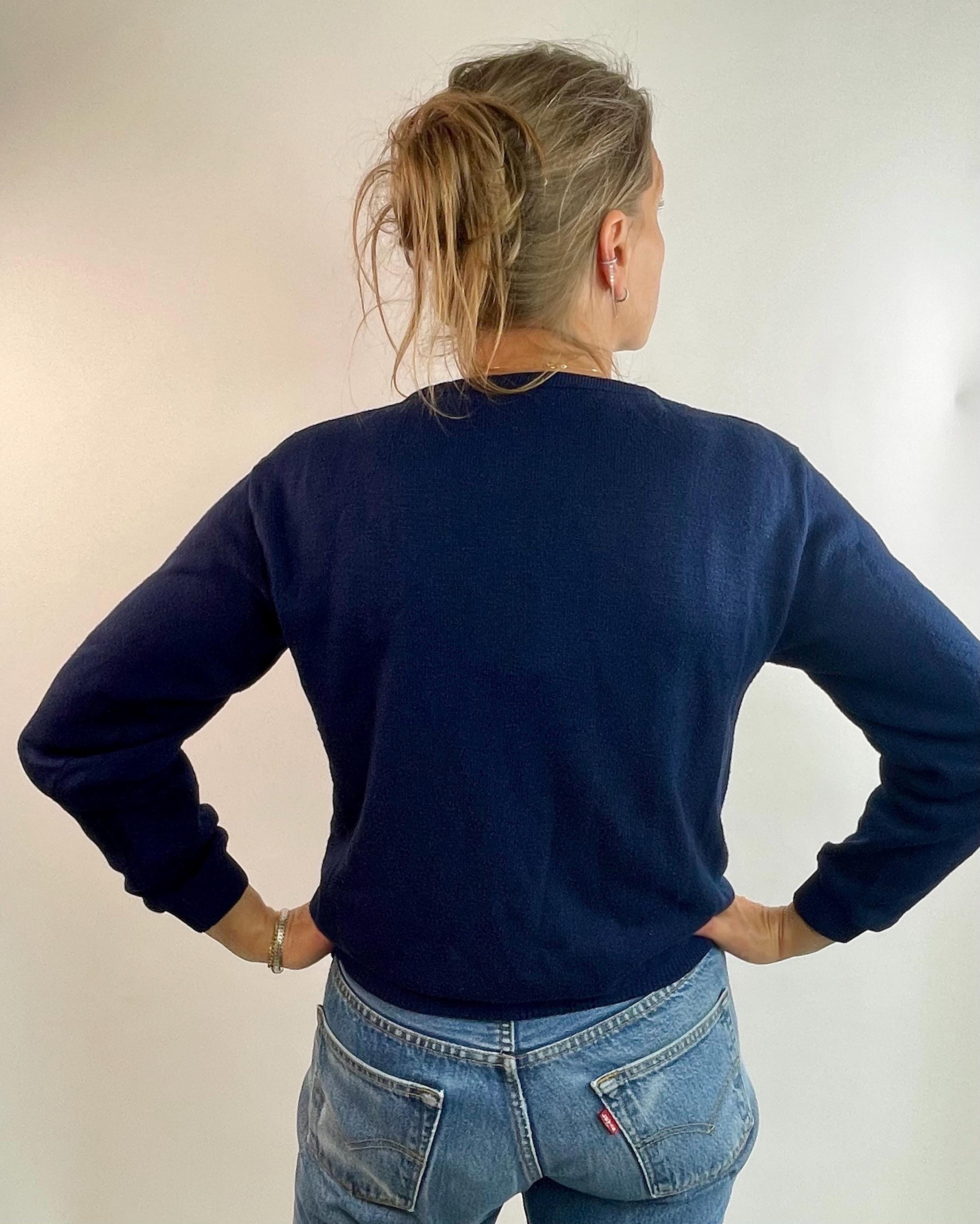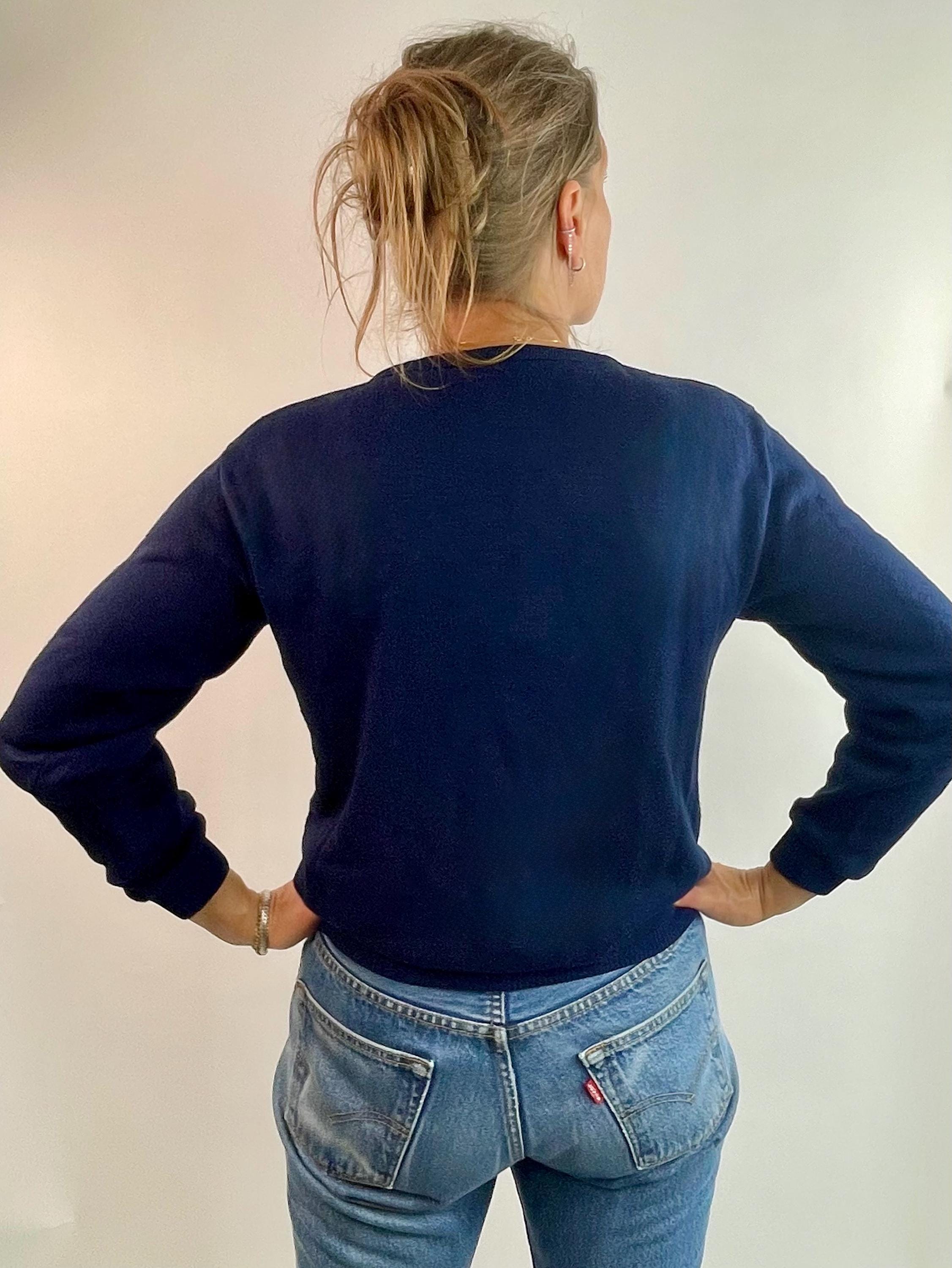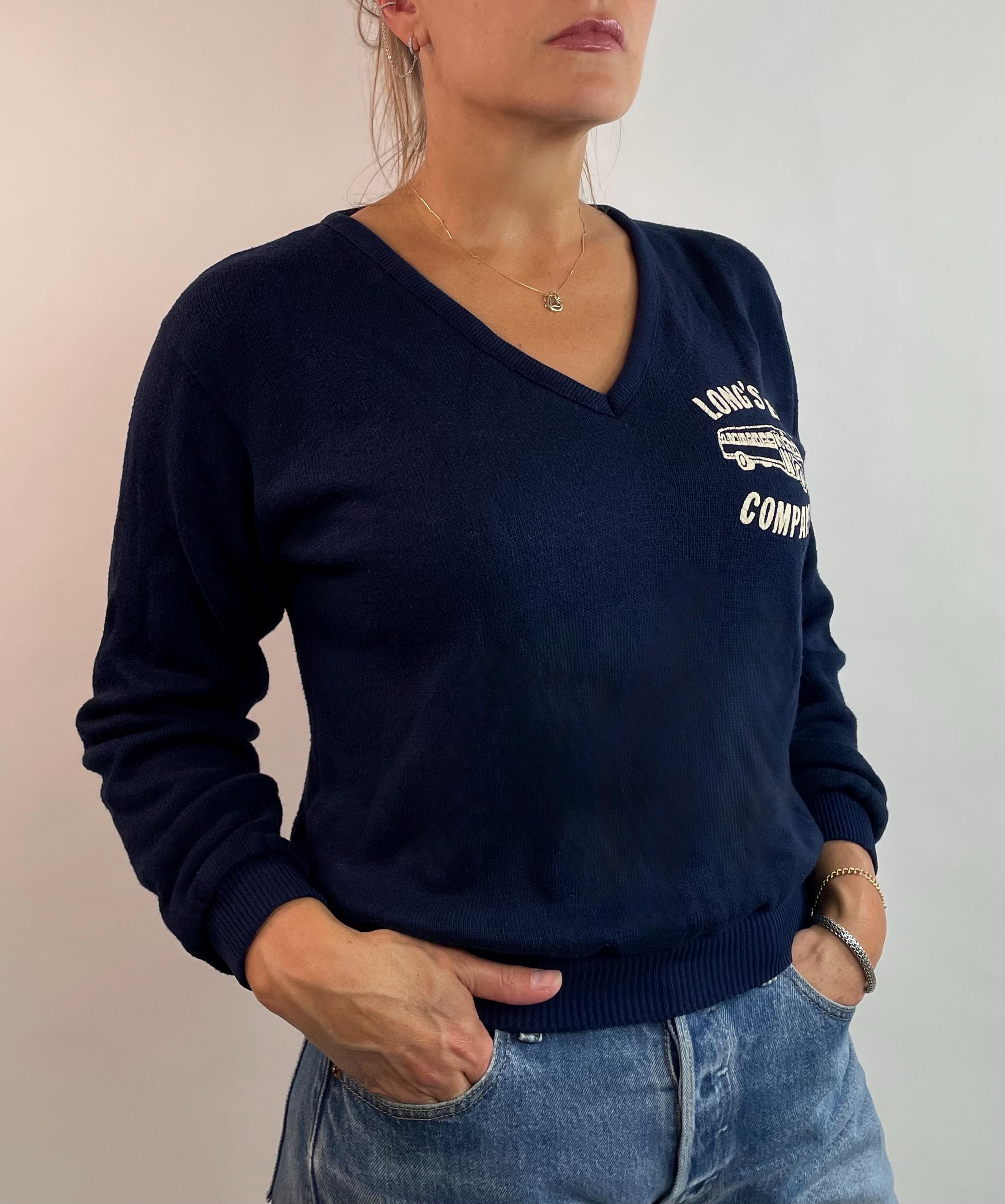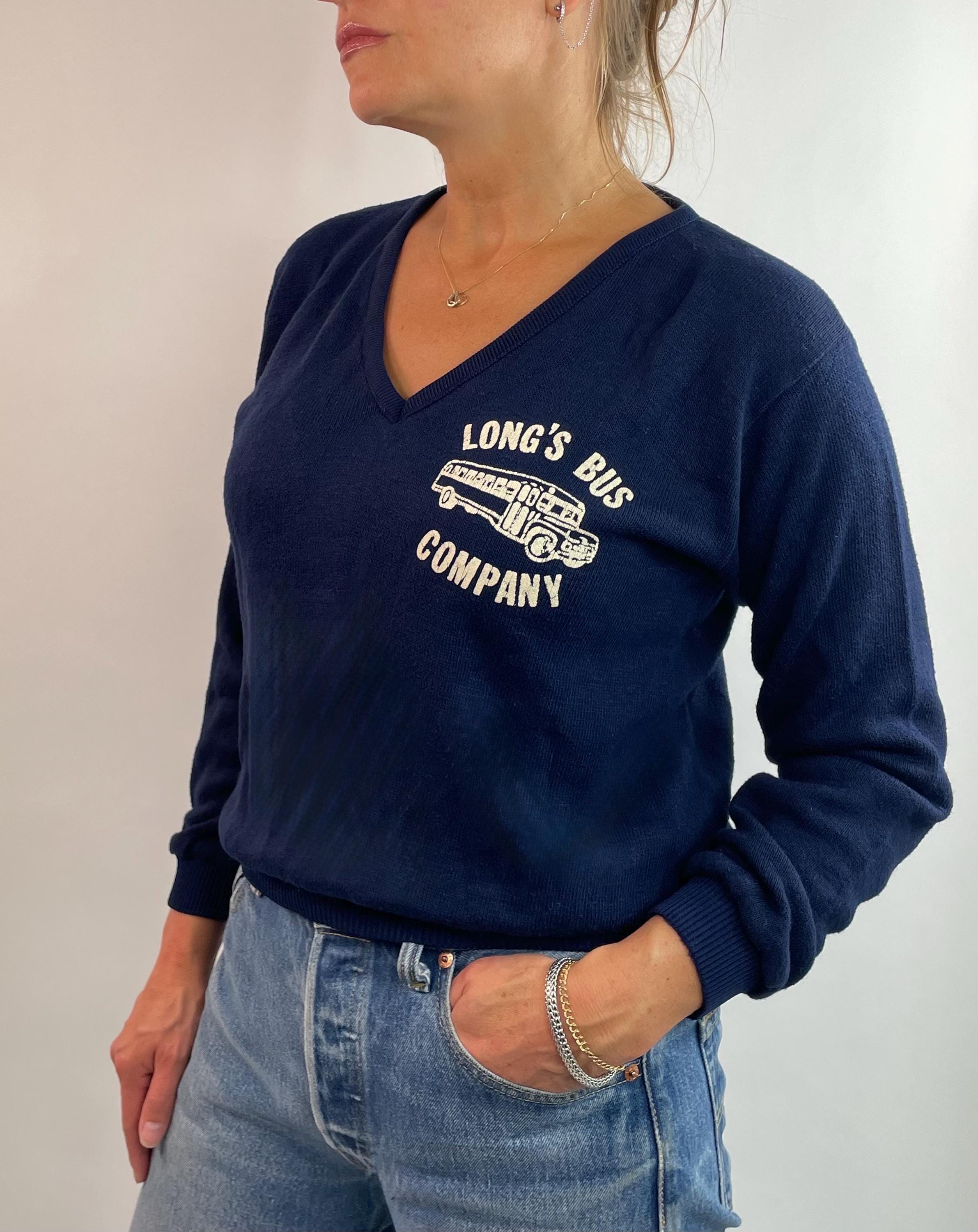 Vintage late 70's logo print V neck knit sweater top in navy blue in a soft, over- time washed acrylic and wool blend. Fabric has some stretch to it. Has white logo of Long's Bus Company. Vintage 90's looking grunge chic! Has elasticized waistband and cuffs. Vintage size S. Fits modern sizes S-M best.