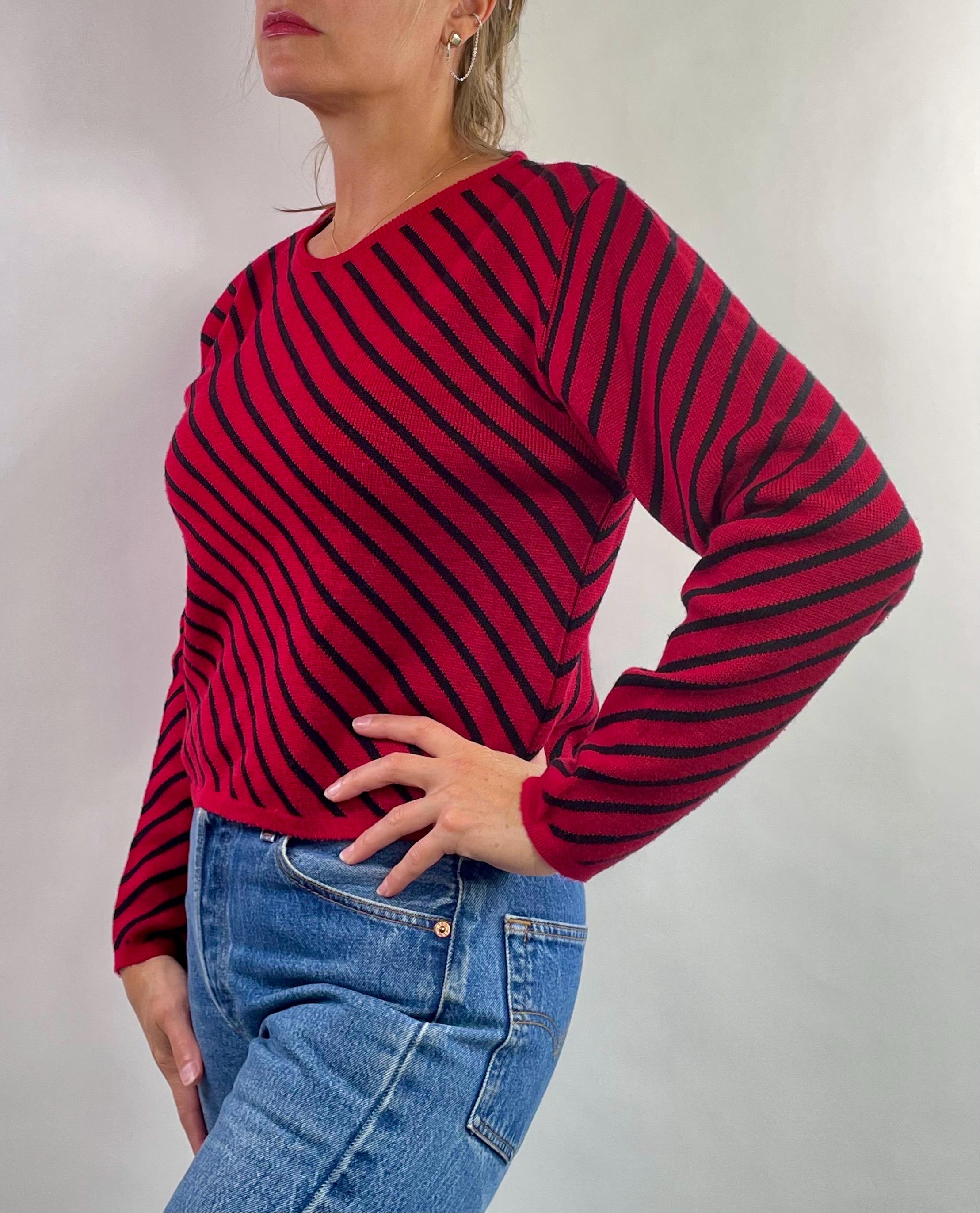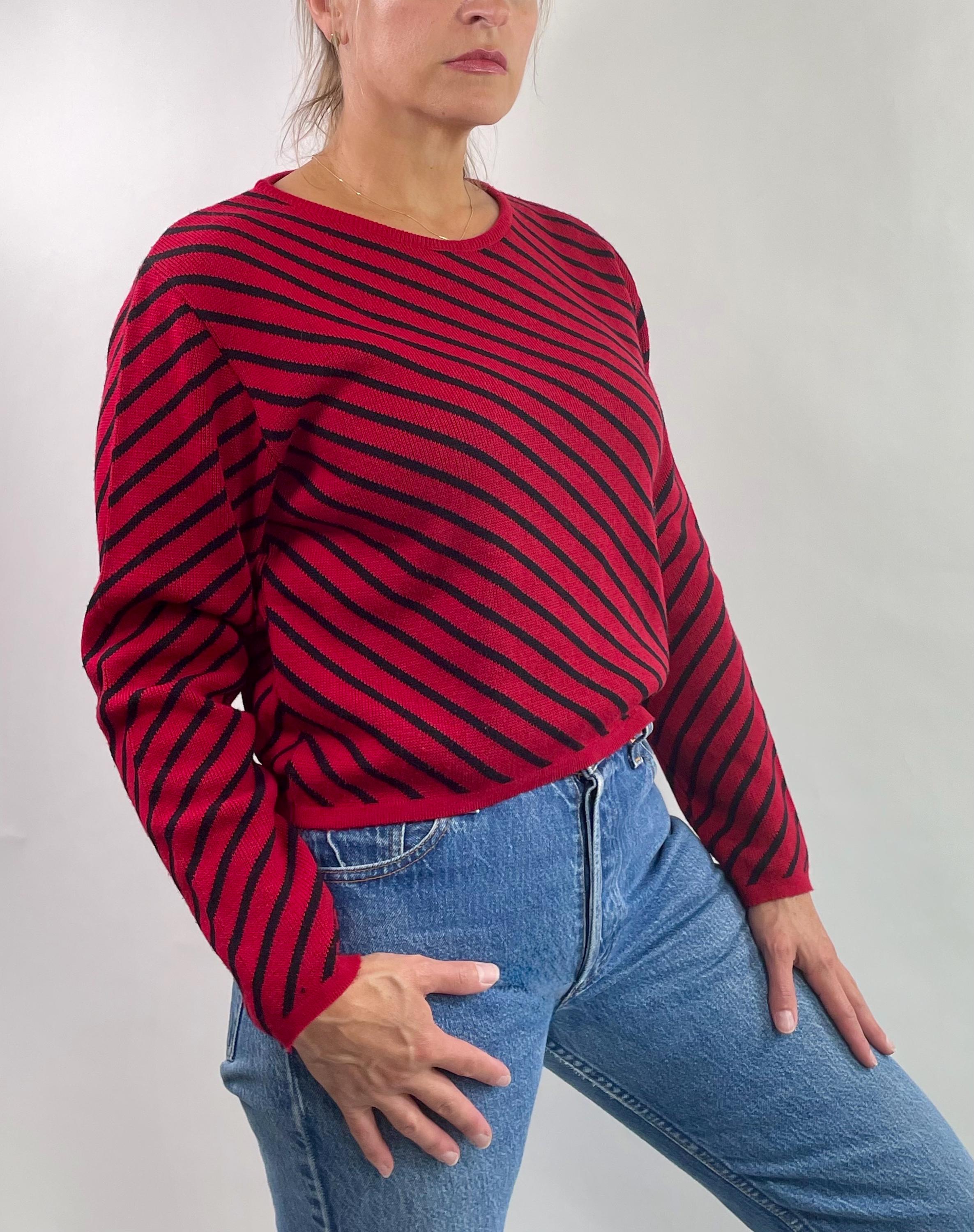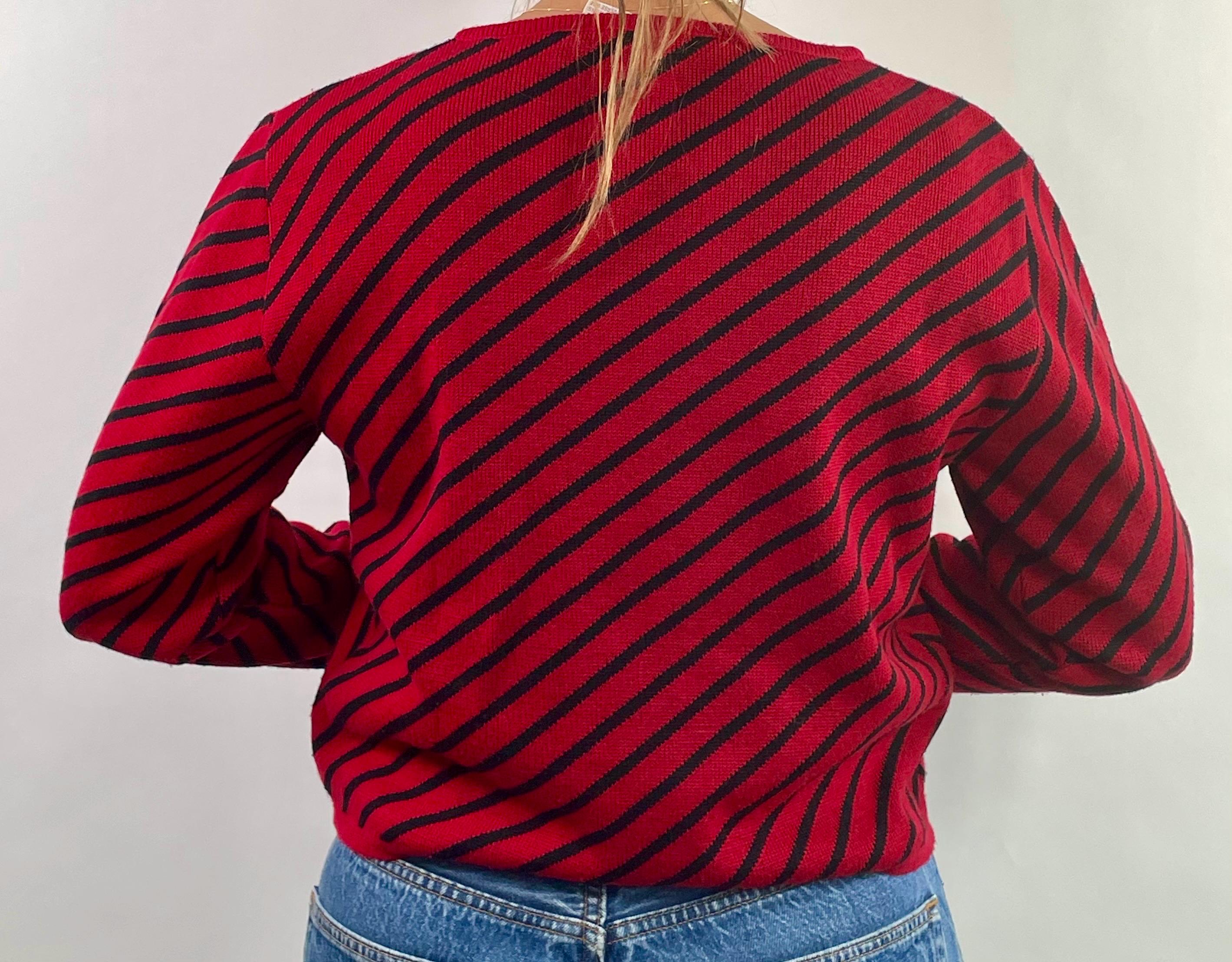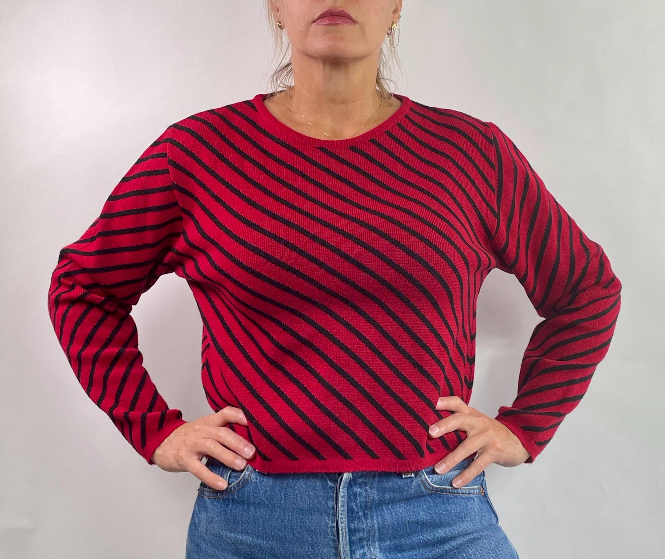 Vintage 90's graphic asymmetrical stripe boxy shape sweater. Knit is 100% fine wool. Has scoop neck line and shorter style shape. Great sweater for work with black pants or skirt. Looks great for casual wear with high waist denim. Made in Italy. By: Jones New York. Vintage size L. Fits modern ladies' sizes 4-10 best.