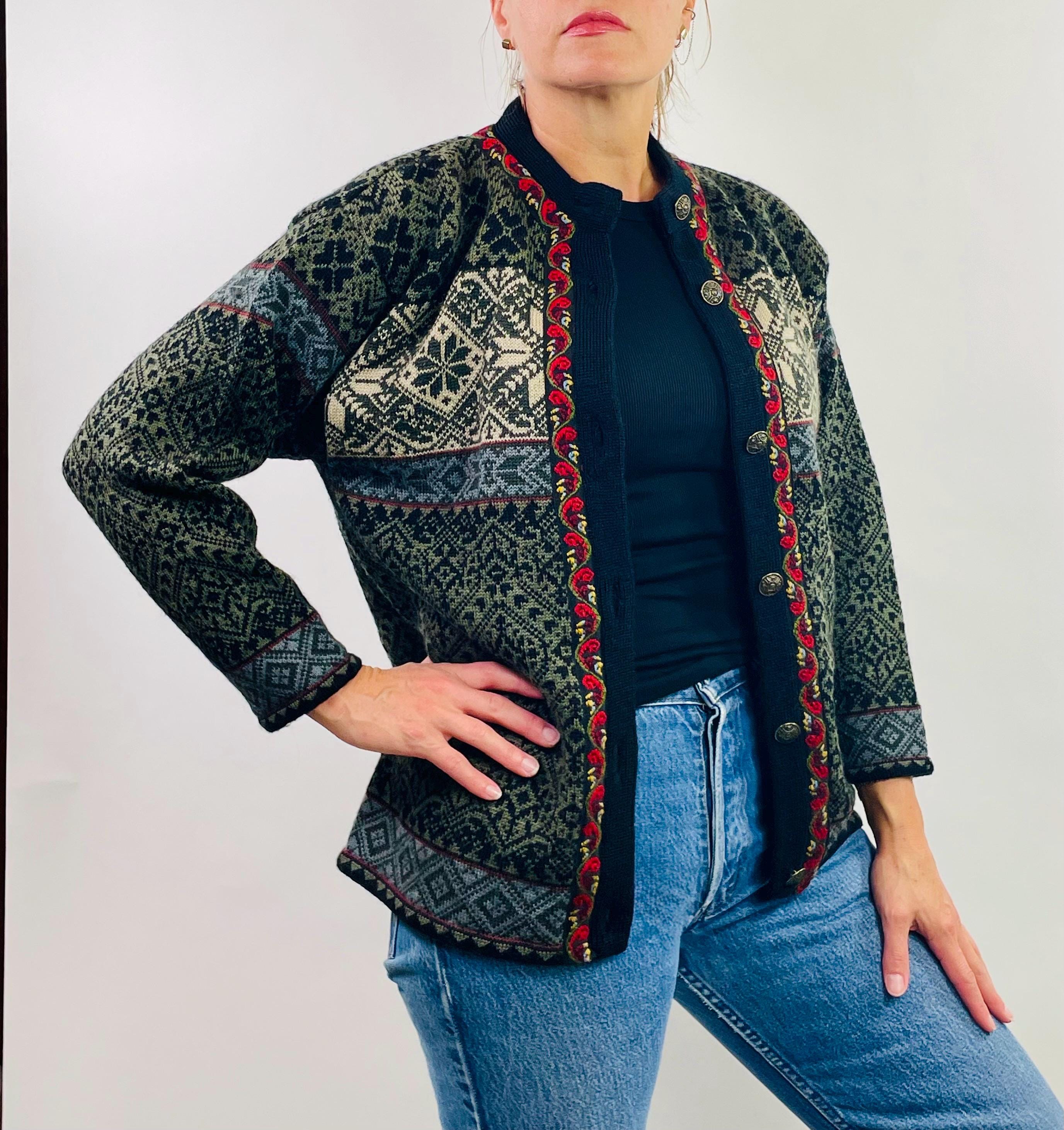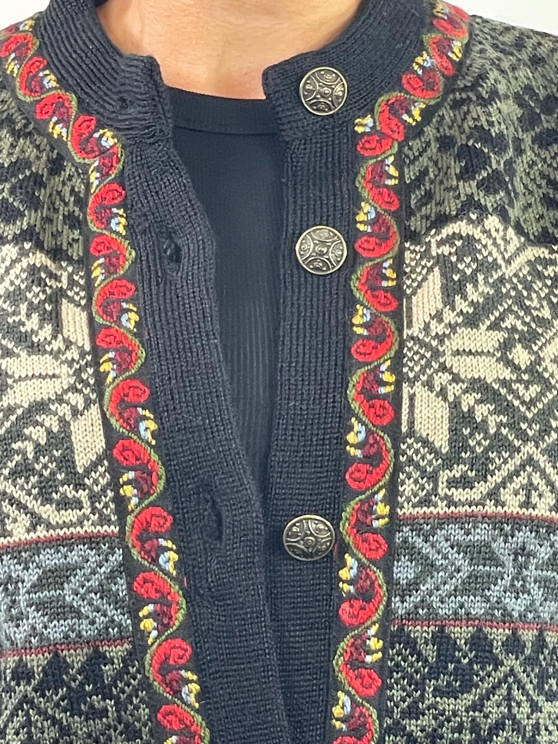 Vintage 80's wool knit cardigan sweater. Has 6 folk patterned silver metal buttons. Black, grey,loden green, and maroon red colorful wool yarn knit; also has red and green embroidery trim on front button placket. Has traditional cardigan style collar, and long sleeves with black colored knit cuffs. Has some small marks that have been repaired on placket. These are very minimal and not noticeable on wear. Made in Iceland. By: Norskwear. Vintage size XS. Fits modern ladies' sizes 2-8 best.