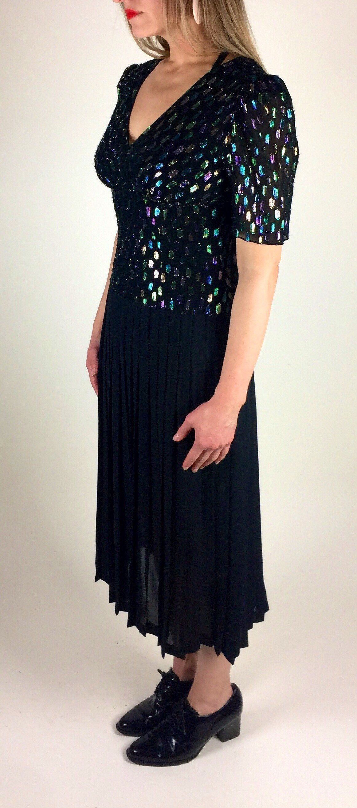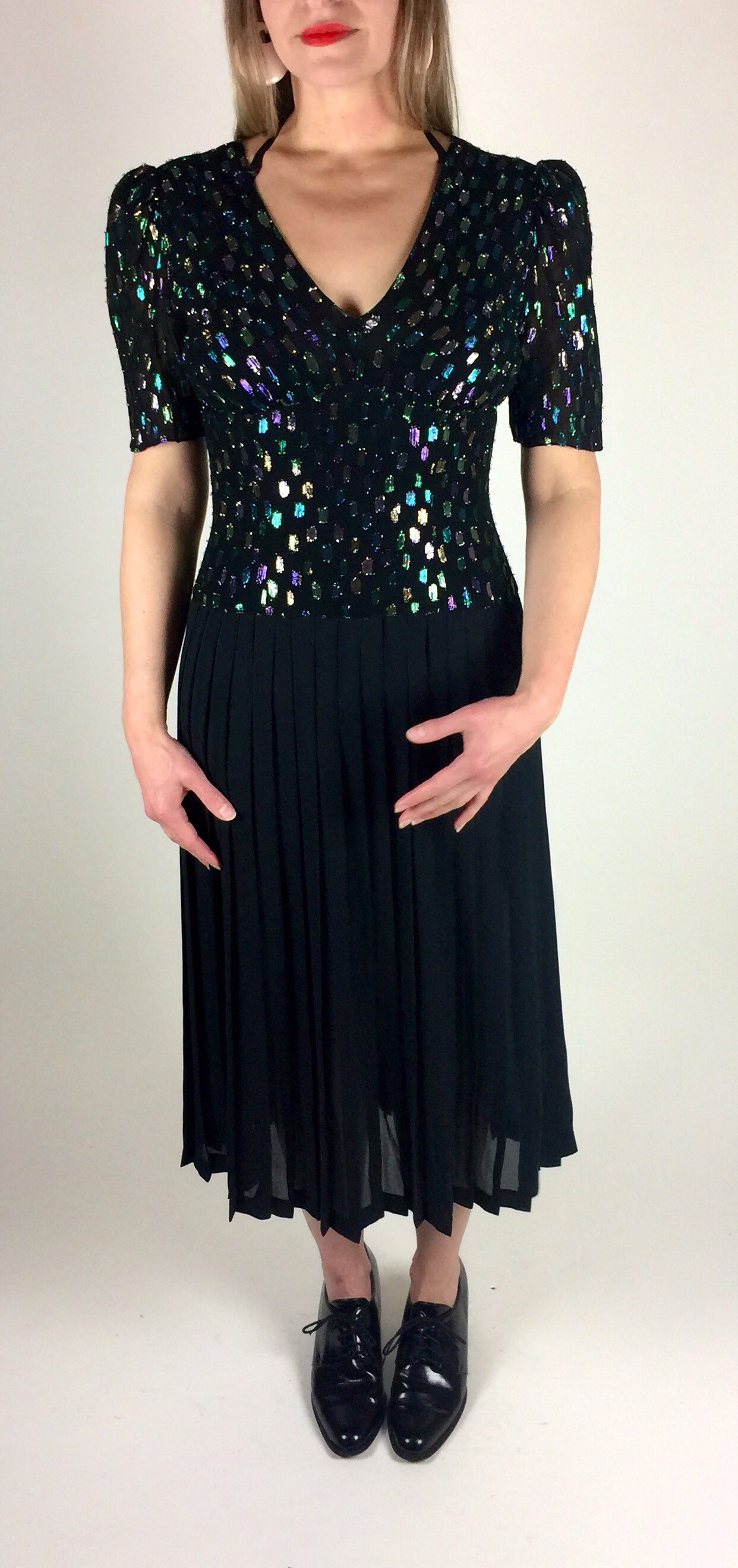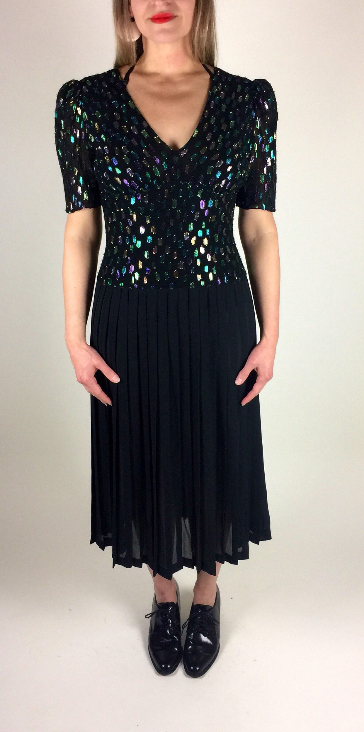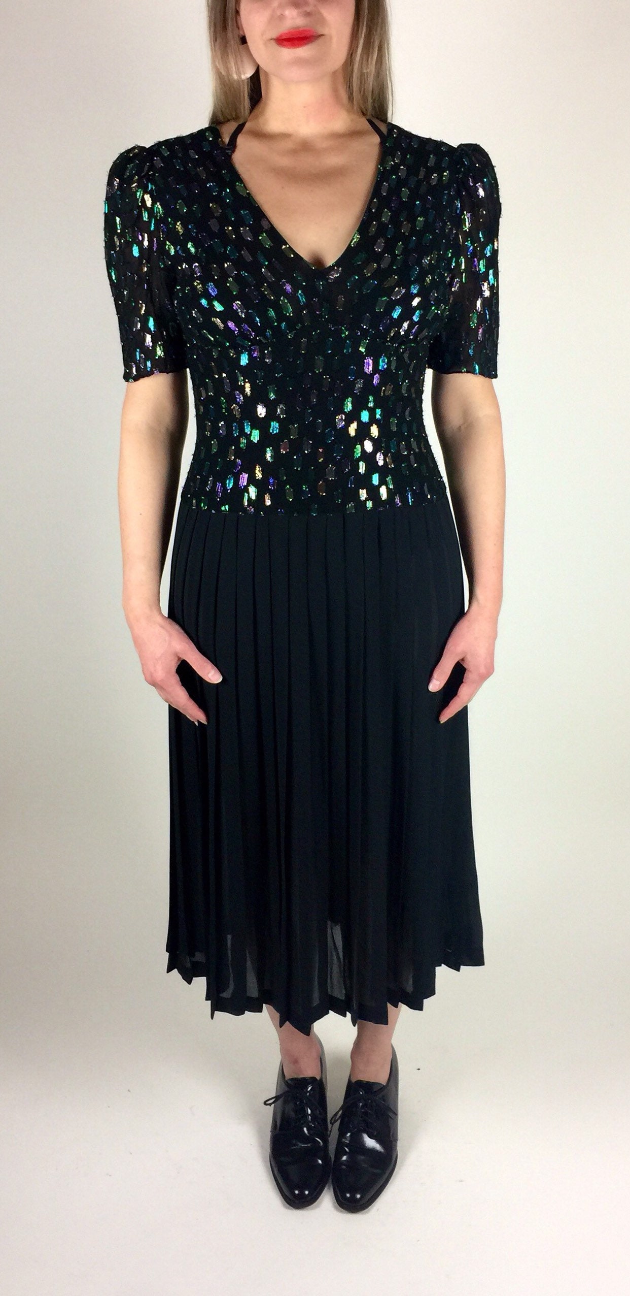 Vintage 80's 90's black multicolored metallic pleated skirt midi length dress. Has colored metallic graphic woven print, drop waist bodice, deep V neck with bust gathering details, semi - sheer pleated skirt, and back zipper. By: Lizzie + Johnny.