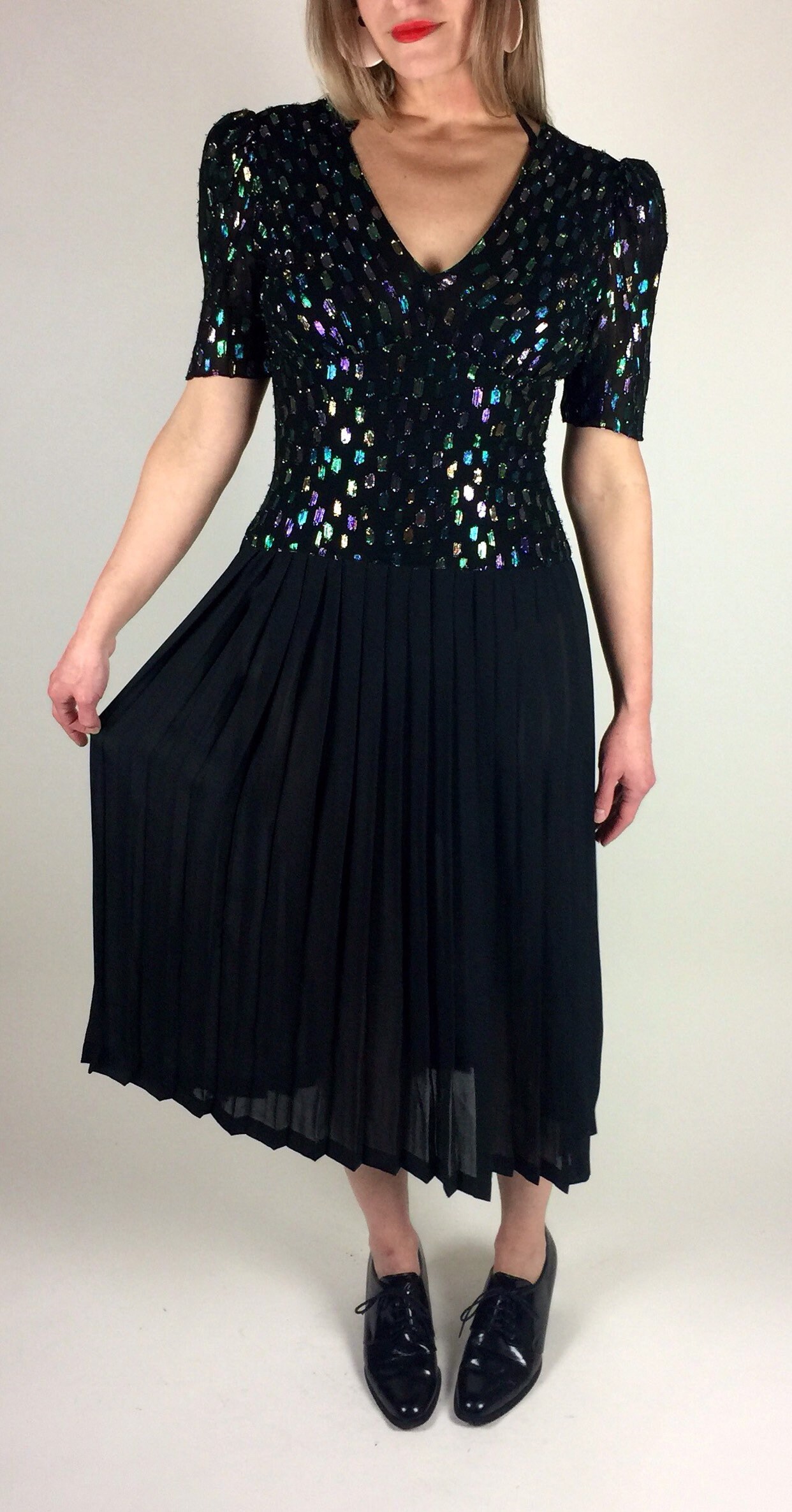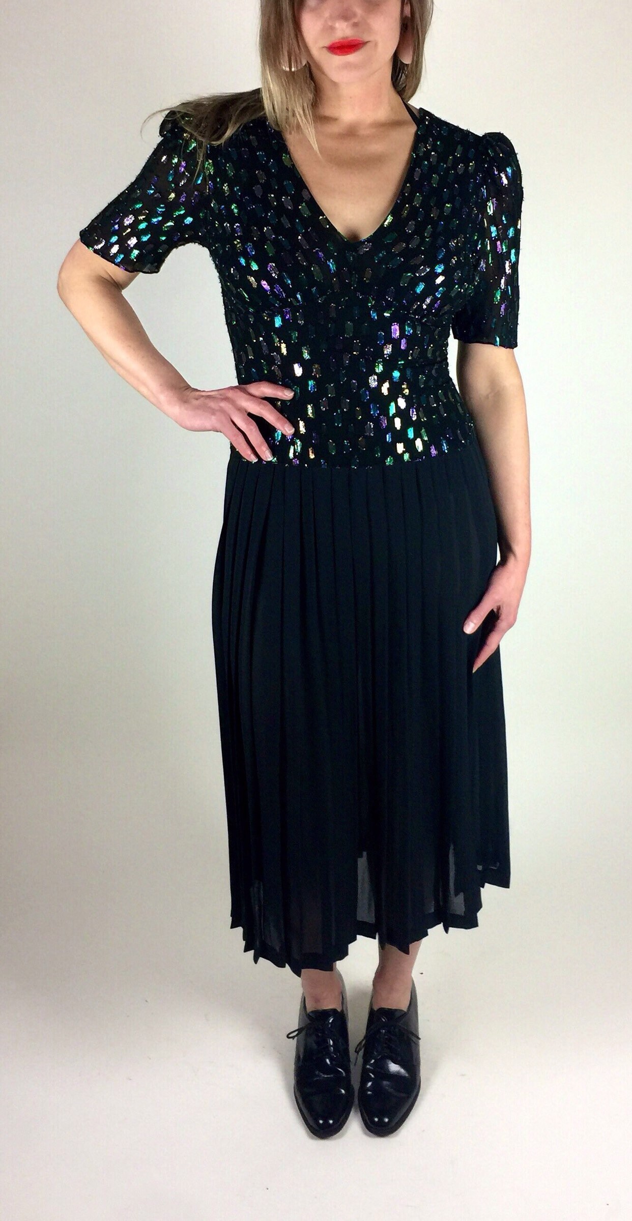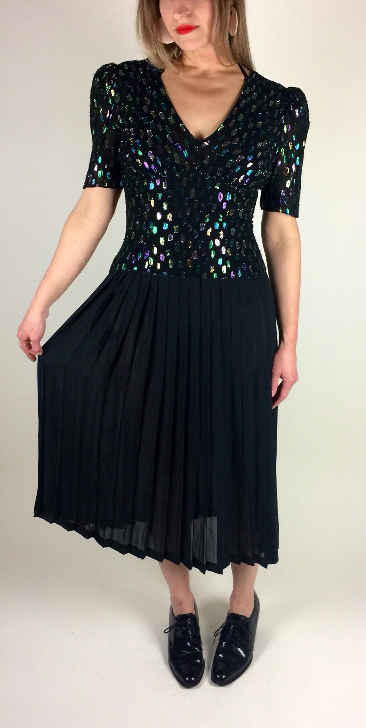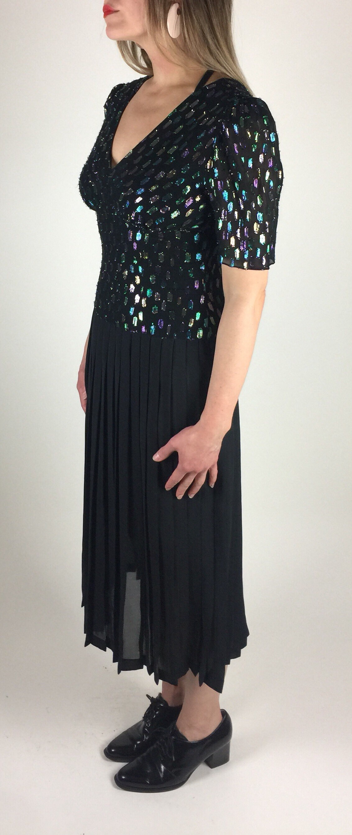 Vintage 80's 90's black multicolored metallic pleated skirt midi length dress. Has colored metallic graphic woven print, drop waist bodice, deep V neck with bust gathering details, semi - sheer pleated skirt, and back zipper. By: Lizzie + Johnny.