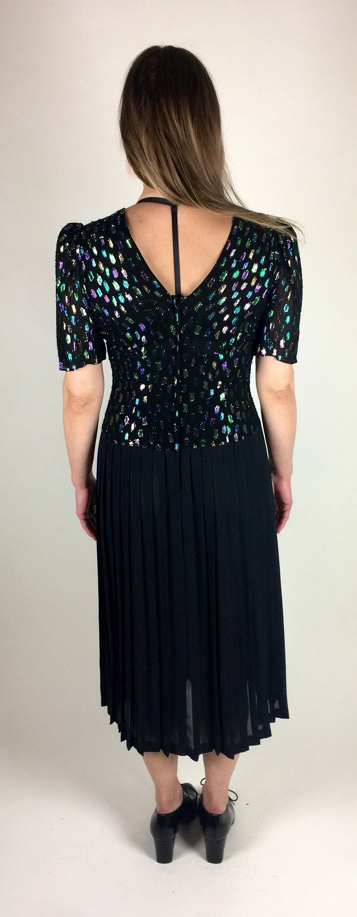 Vintage 80's 90's black multicolored metallic pleated skirt midi length dress